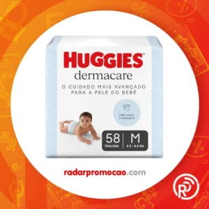 Fralda Huggies Premium Dermacare Tamanho M – 58 Fraldas Premium com formato anatômico, materiais ultra macios e respiráveis. Super absorção de até 12 horas e